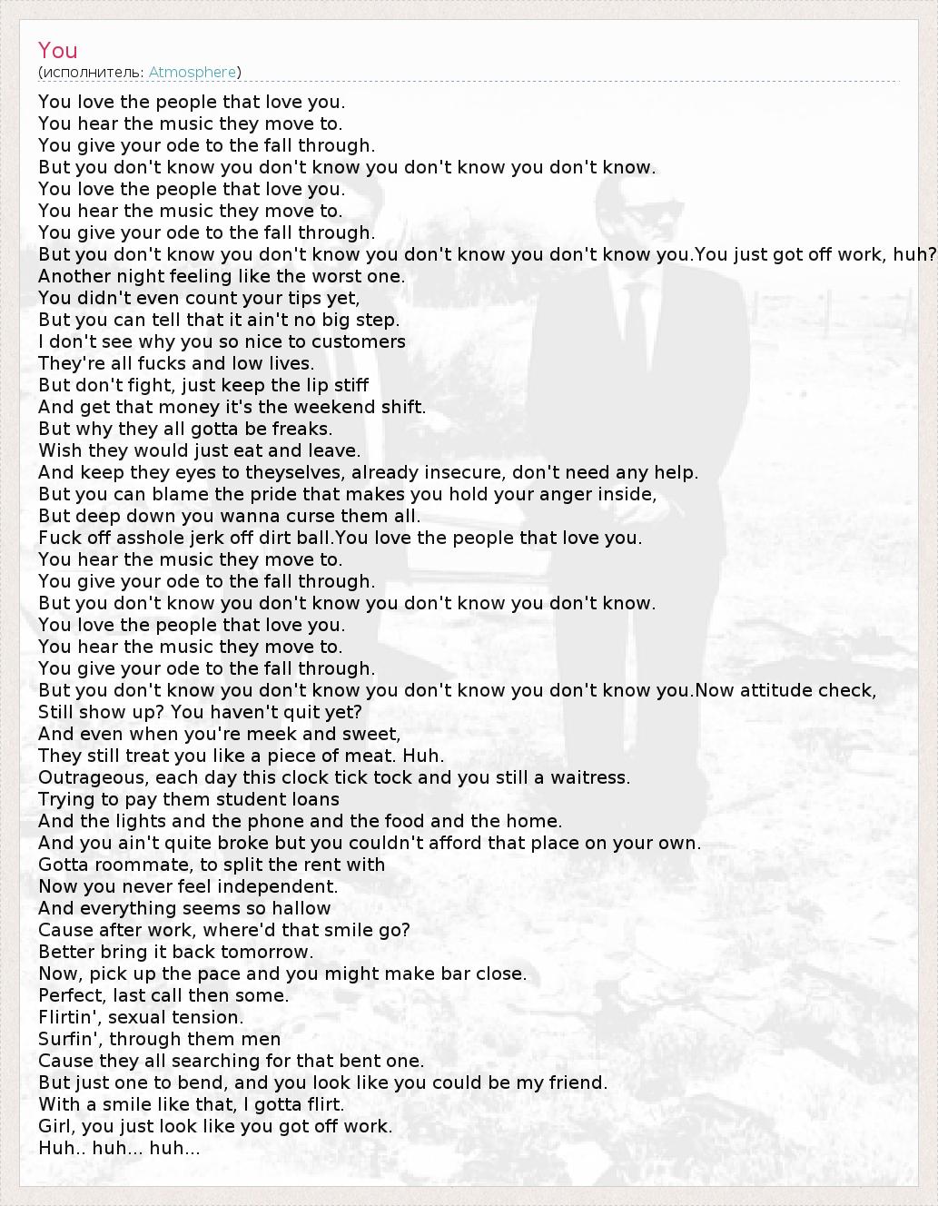Это интересно:«Atmosphere» - одна из популярнейших групп в американском независимом хип-хопе. Группу создали в 1993-м году Sean Daley, известный как Slug и Spawn (Derek Turner, сейчас известный как «Rek The Heavyweight»). Последний покинул группу после выхода их первого альбома «Overcast!»В старших классах школы Sean Daley с другом Brent Sayer решили создать группу. Взяв для этой цели псевдонимы Slug (взял псевдоним от клички своего отца - Sluggo)... продолжение