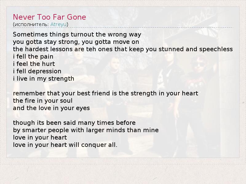 А как ты думаешь, о чем песня "Never Too Far Gone" ?