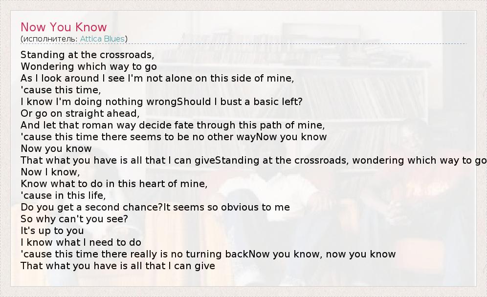 Standing at the crossroads, Wondering which way to go As I look around I see I'm not alone on this side of mine, 'cause this time, I know I'm doing nothing wrongShould I bust a basic left? Or go on straight ahead, And let that roman way decide fate through this path of mine, 'cause this time there seems to be no other wayNow you know Now you know That what you have is all that I can giveStanding at the crossroads, wondering which way to go Now I know, Know what to do in this heart of mine, 'cause in this life, Do you get a second chance?It seems so obvious to me So why can't you see? It's up to you I know what I need to do 'cause this time there really is no turning backNow you know, now you know That what you have is all that I can give