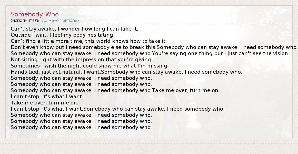Somebody who can stay awake. I need somebody who.Take me over, turn me on.
