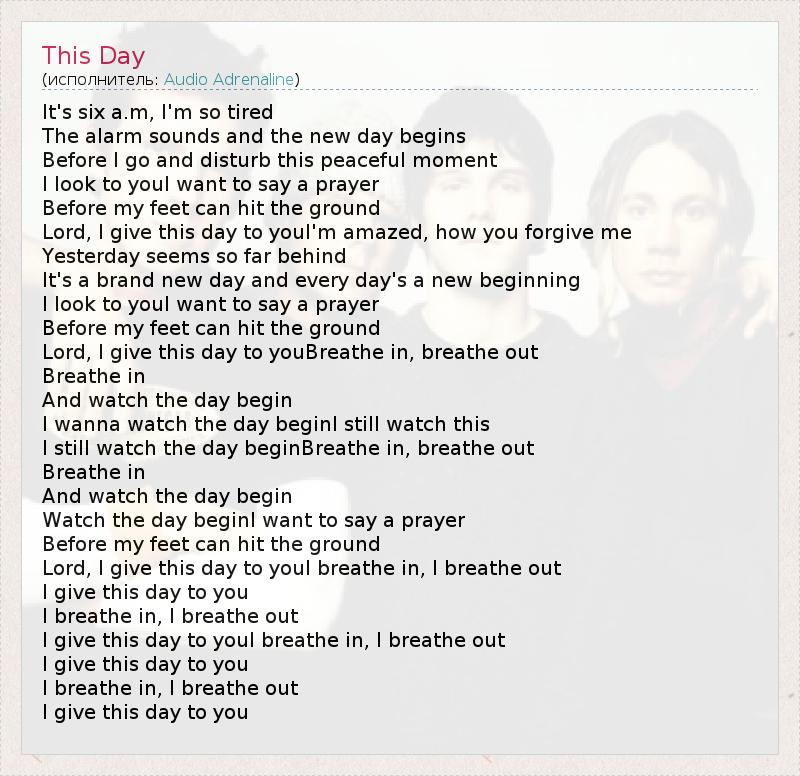 It's six a.m, I'm so tired The alarm sounds and the new day begins Before I go and disturb this peaceful moment I look to youI want to say a prayer Before my feet can hit the ground Lord, I give this day to youI'm amazed, how you forgive me Yesterday seems so far behind It's a brand new day and every day's a new beginning I look to youI want to say a prayer Before my feet can hit the ground Lord, I give this day to youBreathe in, breathe out Breathe in And watch the day begin I wanna watch the day beginI still watch this I still watch the day beginBreathe in, breathe out Breathe in And watch the day begin Watch the day beginI want to say a prayer Before my feet can hit the ground Lord, I give this day to youI breathe in, I breathe out I give this day to you I breathe in, I breathe out I give this day to youI breathe in, I breathe out I give this day to you I breathe in, I breathe out I give this day to you