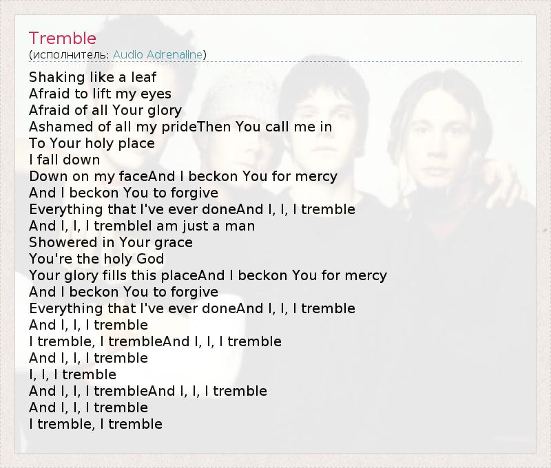 Shaking like a leaf Afraid to lift my eyes Afraid of all Your glory Ashamed of all my prideThen You call me in To Your holy place I fall down Down on my faceAnd I beckon You for mercy And I beckon You to forgive Everything that I've ever doneAnd I, I, I tremble And I, I, I trembleI am just a man Showered in Your grace You're the holy God Your glory fills this placeAnd I beckon You for mercy And I beckon You to forgive Everything that I've ever doneAnd I, I, I tremble And I, I, I tremble I tremble, I trembleAnd I, I, I tremble And I, I, I tremble I, I, I tremble And I, I, I trembleAnd I, I, I tremble And I, I, I tremble I tremble, I tremble