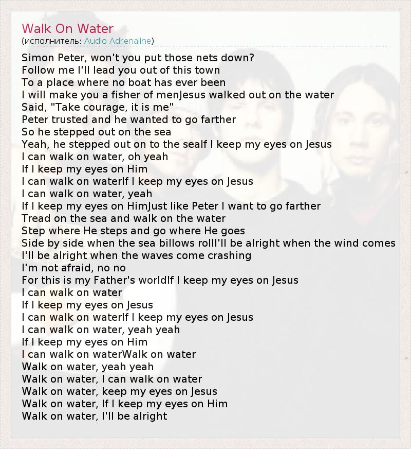 Simon Peter, won't you put those nets down? Follow me I'll lead you out of this town To a place where no boat has ever been I will make you a fisher of menJesus walked out on the water Said, "Take courage, it is me" Peter trusted and he wanted to go farther So he stepped out on the sea Yeah, he stepped out on to the seaIf I keep my eyes on Jesus I can walk on water, oh yeah If I keep my eyes on Him I can walk on waterIf I keep my eyes on Jesus I can walk on water, yeah If I keep my eyes on HimJust like Peter I want to go farther Tread on the sea and walk on the water Step where He steps and go where He goes Side by side when the sea billows rollI'll be alright when the wind comes I'll be alright when the waves come crashing I'm not afraid, no no For this is my Father's worldIf I keep my eyes on Jesus I can walk on water If I keep my eyes on Jesus I can walk on waterIf I keep my eyes on Jesus I can walk on water, yeah yeah If I keep my eyes on Him I can walk on waterWalk on water Walk on water, yeah yeah Walk on water, I can walk on water Walk on water, keep my eyes on Jesus Walk on water, If I keep my eyes on Him Walk on water, I'll be alright