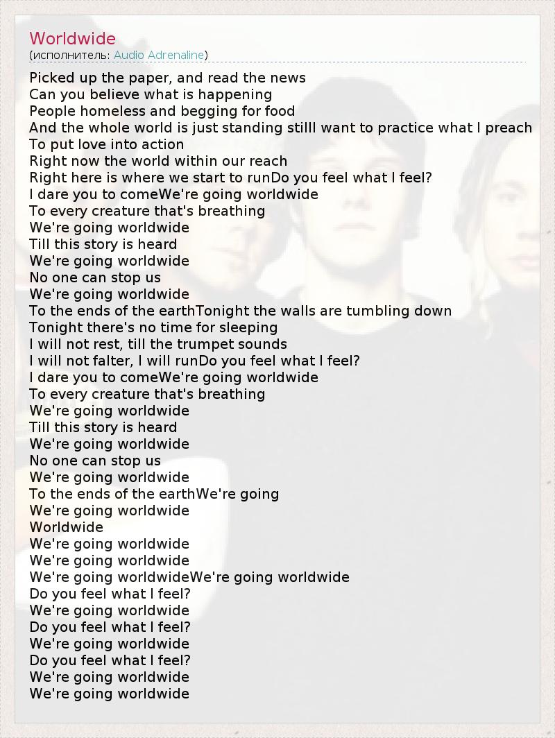 Picked up the paper, and read the news Can you believe what is happening People homeless and begging for food And the whole world is just standing stillI want to practice what I preach To put love into action Right now the world within our reach Right here is where we start to runDo you feel what I feel? I dare you to comeWe're going worldwide To every creature that's breathing We're going worldwide Till this story is heard We're going worldwide No one can stop us We're going worldwide To the ends of the earthTonight the walls are tumbling down Tonight there's no time for sleeping I will not rest, till the trumpet sounds I will not falter, I will runDo you feel what I feel? I dare you to comeWe're going worldwide To every creature that's breathing We're going worldwide Till this story is heard We're going worldwide No one can stop us We're going worldwide To the ends of the earthWe're going We're going worldwide Worldwide We're going worldwide We're going worldwide We're going worldwideWe're going worldwide Do you feel what I feel? We're going worldwide Do you feel what I feel? We're going worldwide Do you feel what I feel? We're going worldwide We're going worldwide