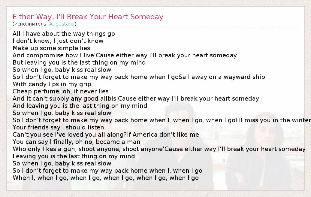 ГлавнаяИсполнителиAugustanaEither Way, I'll Break Your Heart Someday