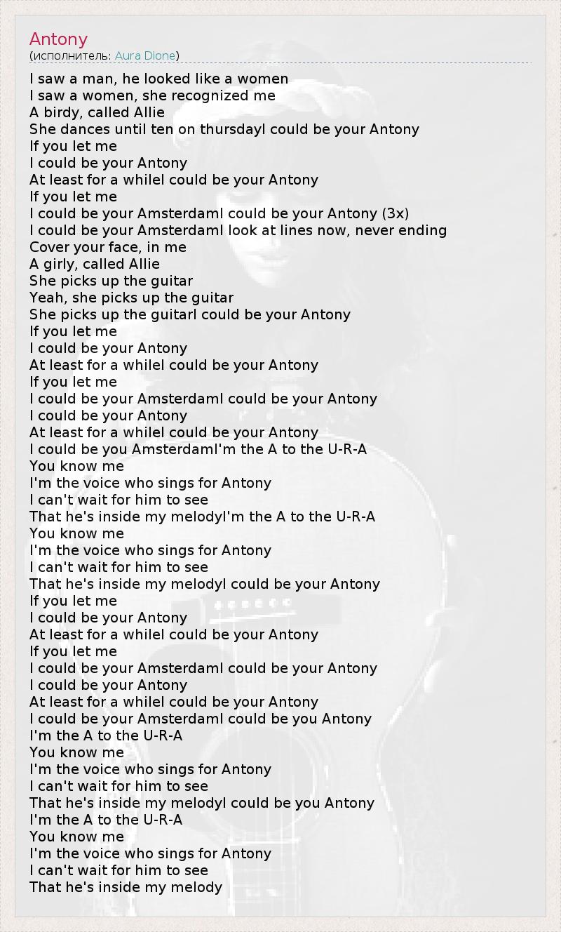 I saw a man, he looked like a women I saw a women, she recognized me A birdy, called Allie She dances until ten on thursdayI could be your Antony If you let me I could be your Antony At least for a whileI could be your Antony If you let me I could be your AmsterdamI could be your Antony (3x) I could be your AmsterdamI look at lines now, never ending Cover your face, in me A girly, called Allie She picks up the guitar Yeah, she picks up the guitar She picks up the guitarI could be your Antony If you let me I could be your Antony At least for a whileI could be your Antony If you let me I could be your AmsterdamI could be your Antony I could be your Antony At least for a whileI could be your Antony I could be you AmsterdamI'm the A to the U-R-A You know me I'm the voice who sings for Antony I can't wait for him to see That he's inside my melodyI'm the A to the U-R-A You know me I'm the voice who sings for Antony I can't wait for him to see That he's inside my melodyI could be your Antony If you let me I could be your Antony At least for a whileI could be your Antony If you let me I could be your AmsterdamI could be your Antony I could be your Antony At least for a whileI could be your Antony I could be your AmsterdamI could be you Antony I'm the A to the U-R-A You know me I'm the voice who sings for Antony I can't wait for him to see That he's inside my melodyI could be you Antony I'm the A to the U-R-A You know me I'm the voice who sings for Antony I can't wait for him to see That he's inside my melody