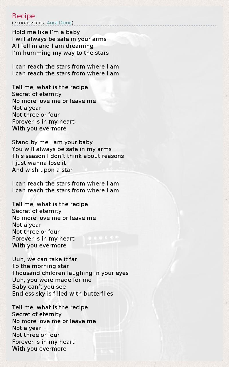 Рецепт Обними меня, как ребенка, Ведь в твоих обьятиях я буду всегда в безопасности. Все погрузилось в темноту, и я сплю, Напевая песенку по дороге к звездам. Я и отсюда смогу достать до зведы, Я и отсюда смогу достать до зведы. Расскажи мне рецепт Тайны вечного бытия, Люби и больше меня не покидай Ни на год, Ни на четыре, ни на три дня. В моем сердце ты На веки вечные. Будь рядом со мной, ведь я — твоя малышка, В моих обьятиях ты всегда будешь в безопасности. Теперь мне не нужны поводы: Я просто хочу потерять рассудок И загадать желание, когда падает звезда. Я и отсюда смогу достать до зведы, Я и отсюда смогу достать до зведы. Расскажи мне рецепт Тайны вечного бытия, Люби и больше меня не покидай Ни на год, Ни на четыре, ни на три дня. В моем сердце ты На веки вечные. О, мы способны подняться высоко, К утренней звезде, И твои глаза искрятся смехом, как у тысячи детей. О, ты был создан для меня; Любимый, разве ты не видишь — Бабочки заполнили все бескрайнее небо. Расскажи мне рецепт Тайны вечного бытия, Люби и больше меня не покидай Ни на год, Ни на четыре, ни на три дня. В моем сердце ты На веки вечные. Перевод: Elaine