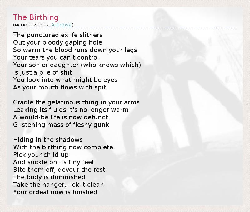 The punctured exlife slithers Out your bloody gaping hole So warm the blood runs down your legs Your tears you can't control Your son or daughter (who knows which) Is just a pile of shit You look into what might be eyes As your mouth flows with spit Cradle the gelatinous thing in your arms Leaking its fluids it's no longer warm A would-be life is now defunct Glistening mass of fleshy gunk Hiding in the shadows With the birthing now complete Pick your child up And suckle on its tiny feet Bite them off, devour the rest The body is diminished Take the hanger, lick it clean Your ordeal now is finished