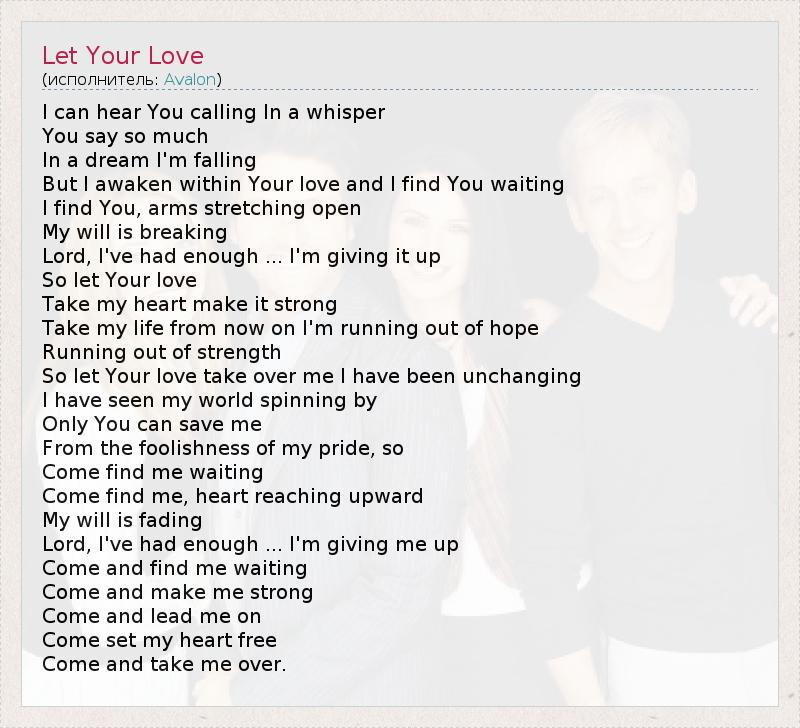 I can hear You calling In a whisper You say so much In a dream I'm falling But I awaken within Your love and I find You waiting I find You, arms stretching open My will is breaking Lord, I've had enough ... I'm giving it up So let Your love Take my heart make it strong Take my life from now on I'm running out of hope Running out of strength So let Your love take over me I have been unchanging I have seen my world spinning by Only You can save me From the foolishness of my pride, so Come find me waiting Come find me, heart reaching upward My will is fading Lord, I've had enough ... I'm giving me up Come and find me waiting Come and make me strong Come and lead me on Come set my heart free Come and take me over.