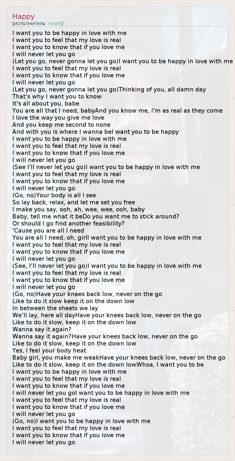 I want you to be happy in love with me I want you to feel that my love is real I want you to know that if you love me I will never let you go (Let you go, never gonna let you go)I want you to be happy in love with me I want you to feel that my love is real I want you to know that if you love me I will never let you go (Let you go, never gonna let you go)Thinking of you, all damn day That's why I want you to know It's all about you, babe You are all that I need, babyAnd you know me, I'm as real as they come I love the way you give me love And you keep me second to none And with you is where I wanna beI want you to be happy I want you to be happy in love with me I want you to feel that my love is real I want you to know that if you love me I will never let you go (See I'll never let you go)I want you to be happy in love with me I want you to feel that my love is real I want you to know that if you love me I will never let you go (Go, no)Your body is all I see So lay back, relax, and let me set you free I make you say, ooh, ah, wee, wee, ooh, baby Baby, tell me what it beDo you want me to stick around? Or should I go find another feasibility? 'Cause you are all I need You are all I need, oh, girlI want you to be happy in love with me I want you to feel that my love is real I want you to know that if you love me I will never let you go (See, I'll never let you go)I want you to be happy in love with me I want you to feel that my love is real I want you to know that if you love me I will never let you go (Go, no)Have your knees back low, never on the go Like to do it slow keep it on the down low In between the sheets we lay We'll lay, here all dayHave your knees back low, never on the go Like to do it slow, keep it on the down low Wanna say it again? Wanna say it again?Have your knees back low, never on the go Like to do it slow, keep it on the down low Yes, I feel your body heat Baby girl, you make me weakHave your knees back low, never on the go Like to do it slow, keep it on the down lowWhoa, I want you to be I want you to be happy in love with me I want you to feel that my love is real I want you to know that if you love me I will never let you goI want you to be happy in love with me I want you to feel that my love is real I want you to know that if you love me I will never let you go (Go, no)I want you to be happy in love with me I want you to feel that my love is real I want you to know that if you love me I will never let you go