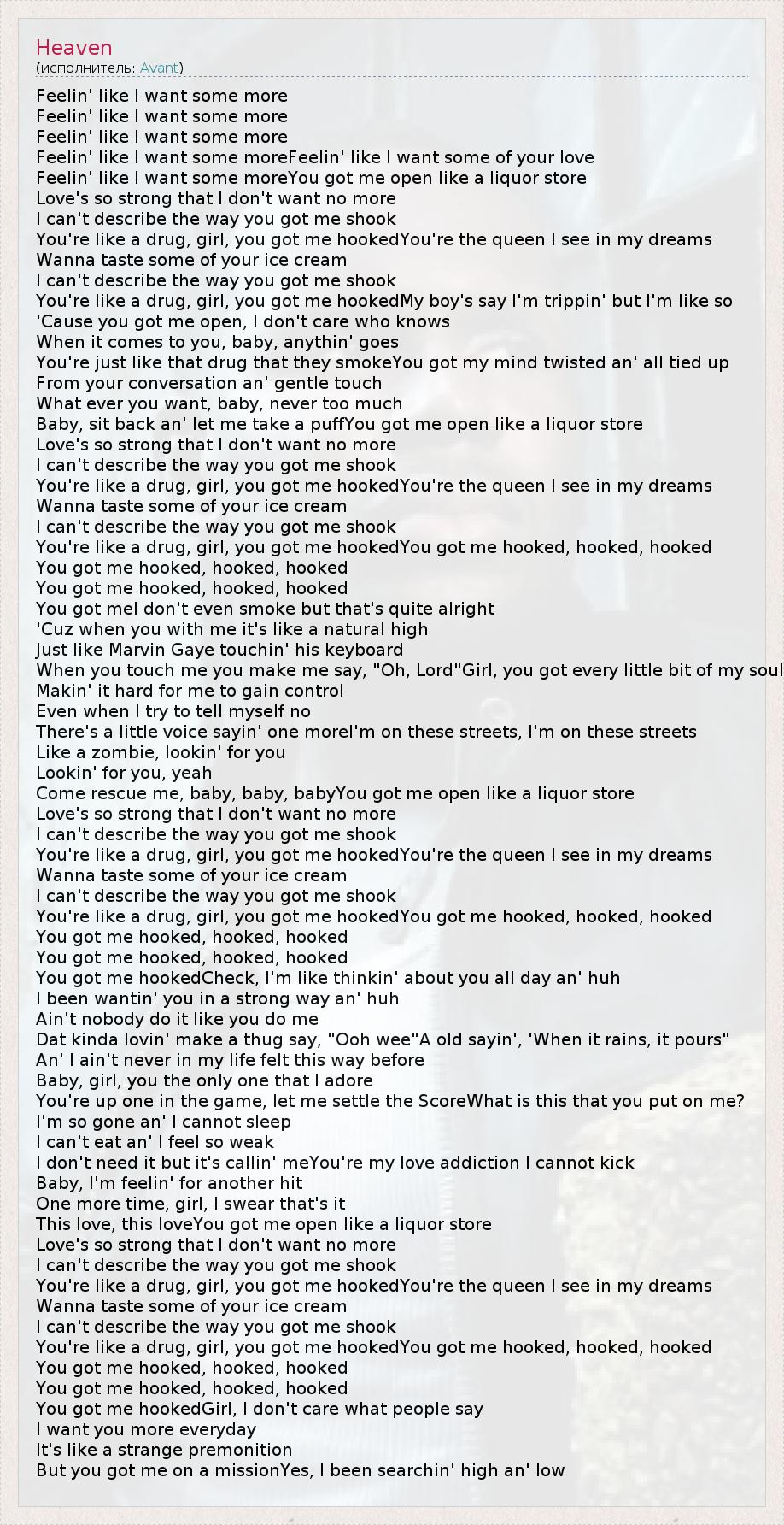 Feelin' like I want some more Feelin' like I want some more Feelin' like I want some more Feelin' like I want some moreFeelin' like I want some of your love Feelin' like I want some moreYou got me open like a liquor store Love's so strong that I don't want no more I can't describe the way you got me shook You're like a drug, girl, you got me hookedYou're the queen I see in my dreams Wanna taste some of your ice cream I can't describe the way you got me shook You're like a drug, girl, you got me hookedMy boy's say I'm trippin' but I'm like so 'Cause you got me open, I don't care who knows When it comes to you, baby, anythin' goes You're just like that drug that they smokeYou got my mind twisted an' all tied up From your conversation an' gentle touch What ever you want, baby, never too much Baby, sit back an' let me take a puffYou got me open like a liquor store Love's so strong that I don't want no more I can't describe the way you got me shook You're like a drug, girl, you got me hookedYou're the queen I see in my dreams Wanna taste some of your ice cream I can't describe the way you got me shook You're like a drug, girl, you got me hookedYou got me hooked, hooked, hooked You got me hooked, hooked, hooked You got me hooked, hooked, hooked You got meI don't even smoke but that's quite alright 'Cuz when you with me it's like a natural high Just like Marvin Gaye touchin' his keyboard When you touch me you make me say, "Oh, Lord"Girl, you got every little bit of my soul Makin' it hard for me to gain control Even when I try to tell myself no There's a little voice sayin' one moreI'm on these streets, I'm on these streets Like a zombie, lookin' for you Lookin' for you, yeah Come rescue me, baby, baby, babyYou got me open like a liquor store Love's so strong that I don't want no more I can't describe the way you got me shook You're like a drug, girl, you got me hookedYou're the queen I see in my dreams Wanna taste some of your ice cream I can't describe the way you got me shook You're like a drug, girl, you got me hookedYou got me hooked, hooked, hooked You got me hooked, hooked, hooked You got me hooked, hooked, hooked You got me hookedCheck, I'm like thinkin' about you all day an' huh I been wantin' you in a strong way an' huh Ain't nobody do it like you do me Dat kinda lovin' make a thug say, "Ooh wee"A old sayin', 'When it rains, it pours" An' I ain't never in my life felt this way before Baby, girl, you the only one that I adore You're up one in the game, let me settle the ScoreWhat is this that you put on me? I'm so gone an' I cannot sleep I can't eat an' I feel so weak I don't need it but it's callin' meYou're my love addiction I cannot kick Baby, I'm feelin' for another hit One more time, girl, I swear that's it This love, this loveYou got me open like a liquor store Love's so strong that I don't want no more I can't describe the way you got me shook You're like a drug, girl, you got me hookedYou're the queen I see in my dreams Wanna taste some of your ice cream I can't describe the way you got me shook You're like a drug, girl, you got me hookedYou got me hooked, hooked, hooked You got me hooked, hooked, hooked You got me hooked, hooked, hooked You got me hookedGirl, I don't care what people say I want you more everyday It's like a strange premonition But you got me on a missionYes, I been searchin' high an' low