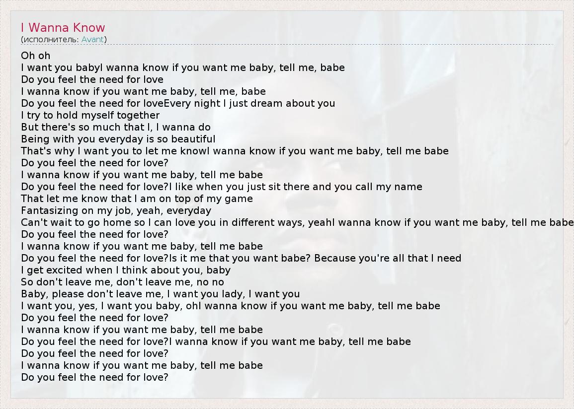 Do you feel the need for love?I wanna know if you want me baby, tell me babe