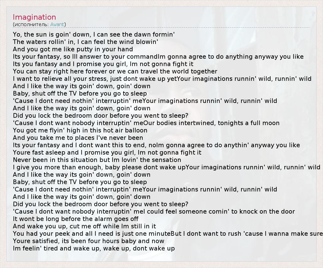 'Cause I dont need nothin' interruptin' meYour imaginations runnin' wild, runnin' wild