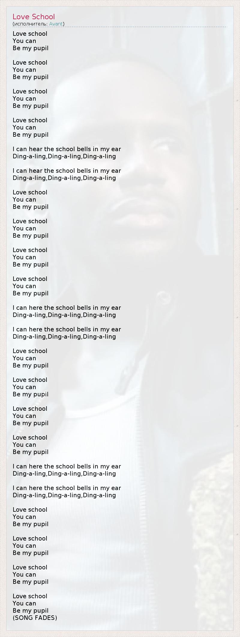 Love school You can Be my pupil Love school You can Be my pupil Love school You can Be my pupil Love school You can Be my pupil I can hear the school bells in my ear Ding-a-ling,Ding-a-ling,Ding-a-ling I can hear the school bells in my ear Ding-a-ling,Ding-a-ling,Ding-a-ling Love school You can Be my pupil Love school You can Be my pupil Love school You can Be my pupil Love school You can Be my pupil I can here the school bells in my ear Ding-a-ling,Ding-a-ling,Ding-a-ling I can here the school bells in my ear Ding-a-ling,Ding-a-ling,Ding-a-ling Love school You can Be my pupil Love school You can Be my pupil Love school You can Be my pupil Love school You can Be my pupil I can here the school bells in my ear Ding-a-ling,Ding-a-ling,Ding-a-ling I can here the school bells in my ear Ding-a-ling,Ding-a-ling,Ding-a-ling Love school You can Be my pupil Love school You can Be my pupil Love school You can Be my pupil Love school You can Be my pupil (SONG FADES)