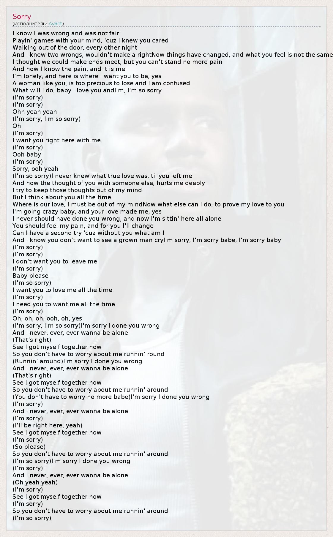 I know I was wrong and was not fair Playin' games with your mind, 'cuz I knew you cared Walking out of the door, every other night And I knew two wrongs, wouldn't make a rightNow things have changed, and what you feel is not the same I thought we could make ends meet, but you can't stand no more pain And now I know the pain, and it is me I'm lonely, and here is where I want you to be, yes A woman like you, is too precious to lose and I am confused What will I do, baby I love you andI'm, I'm so sorry (I'm sorry) (I'm sorry) Ohh yeah yeah (I'm sorry, I'm so sorry) Oh (I'm sorry) I want you right here with me (I'm sorry) Ooh baby (I'm sorry) Sorry, ooh yeah (I'm so sorry)I never knew what true love was, til you left me And now the thought of you with someone else, hurts me deeply I try to keep those thoughts out of my mind But I think about you all the time Where is our love, I must be out of my mindNow what else can I do, to prove my love to you I'm going crazy baby, and your love made me, yes I never should have done you wrong, and now I'm sittin' here all alone You should feel my pain, and for you I'll change Can I have a second try 'cuz without you what am I And I know you don't want to see a grown man cryI'm sorry, I'm sorry babe, I'm sorry baby (I'm sorry) (I'm sorry) I don't want you to leave me (I'm sorry) Baby please (I'm so sorry) I want you to love me all the time (I'm sorry) I need you to want me all the time (I'm sorry) Oh, oh, oh, ooh, oh, yes (I'm sorry, I'm so sorry)I'm sorry I done you wrong And I never, ever, ever wanna be alone (That's right) See I got myself together now So you don't have to worry about me runnin' round (Runnin' around)I'm sorry I done you wrong And I never, ever, ever wanna be alone (That's right) See I got myself together now So you don't have to worry about me runnin' around (You don't have to worry no more babe)I'm sorry I done you wrong (I'm sorry) And I never, ever, ever wanna be alone (I'm sorry) (I'll be right here, yeah) See I got myself together now (I'm sorry) (So please) So you don't have to worry about me runnin' around (I'm so sorry)I'm sorry I done you wrong (I'm sorry) And I never, ever, ever wanna be alone (Oh yeah yeah) (I'm sorry) See I got myself together now (I'm sorry) So you don't have to worry about me runnin' around (I'm so sorry)