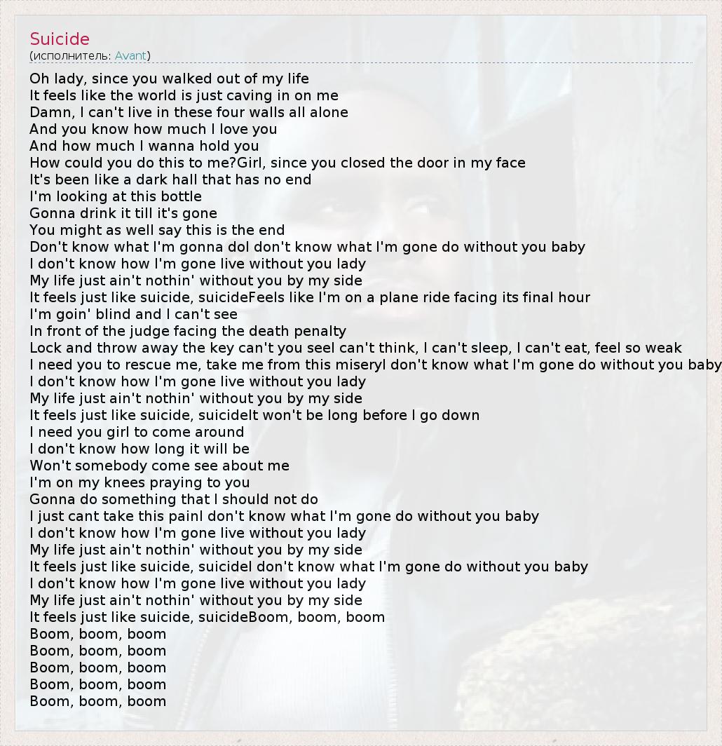 Oh lady, since you walked out of my life It feels like the world is just caving in on me Damn, I can't live in these four walls all alone And you know how much I love you And how much I wanna hold you How could you do this to me?Girl, since you closed the door in my face It's been like a dark hall that has no end I'm looking at this bottle Gonna drink it till it's gone You might as well say this is the end Don't know what I'm gonna doI don't know what I'm gone do without you baby I don't know how I'm gone live without you lady My life just ain't nothin' without you by my side It feels just like suicide, suicideFeels like I'm on a plane ride facing its final hour I'm goin' blind and I can't see In front of the judge facing the death penalty Lock and throw away the key can't you seeI can't think, I can't sleep, I can't eat, feel so weak I need you to rescue me, take me from this miseryI don't know what I'm gone do without you baby I don't know how I'm gone live without you lady My life just ain't nothin' without you by my side It feels just like suicide, suicideIt won't be long before I go down I need you girl to come around I don't know how long it will be Won't somebody come see about me I'm on my knees praying to you Gonna do something that I should not do I just cant take this painI don't know what I'm gone do without you baby I don't know how I'm gone live without you lady My life just ain't nothin' without you by my side It feels just like suicide, suicideI don't know what I'm gone do without you baby I don't know how I'm gone live without you lady My life just ain't nothin' without you by my side It feels just like suicide, suicideBoom, boom, boom Boom, boom, boom Boom, boom, boom Boom, boom, boom Boom, boom, boom Boom, boom, boom