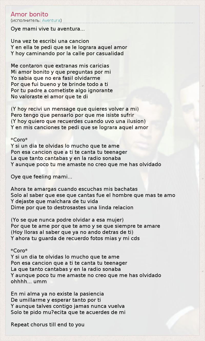 Oye mami vive tu aventura... Una vez te escribi una cancion Y en ella te pedi que se le lograra aquel amor Y hoy caminando por la calle por casualidad Me contaron que extranas mis caricias Mi amor bonito y que preguntas por mi Yo sabia que no era fasil olvidarme Por que fui bueno y te brinde todo a ti Por tu padre a cometiste algo ignorante No valoraste el amor que te di (Y hoy recivi un mensage que quieres volver a mi) Pero tengo que pensarlo por que me isiste sufrir (Y hoy quiero que recuerdes cuando uvo una ilusion) Y en mis canciones te pedi que se lograra aquel amor *Coro* Y si un dia te olvidas lo mucho que te ame Pon esa cancion que a ti te canta tu teenager La que tanto cantabas y en la radio sonaba Y aunque poco tu me amaste no creo que me has olvidado Oye que feeling mami... Ahora te amargas cuando escuchas mis bachatas Solo al saber que ese que cantas fue el hombre que mas te amo Y dejaste que malchara de tu vida Dime por que to destrosastes una linda relacion (Yo se que nunca podre olvidar a esa mujer) Por que te ame por que te amo y se que siempre te amare (Hoy lloras al saber que ya no ando detras de ti) Y ahora tu guarda de recuerdo fotos mias y mi cds *Coro* Y si un dia te olvidas lo mucho que te ame Pon esa cancion que a ti te canta tu teenager La que tanto cantabas y en la radio sonaba Y aunque poco tu me amaste no creo que me has olvidado ohhhh... umm En mi alma ya no existe la pasiencia De umillarme y esperar tanto por ti Y aunque talves contigo jamas nunca vuelva Solo te pido mu?ecita que te acuerdes de mi Repeat chorus till end to you