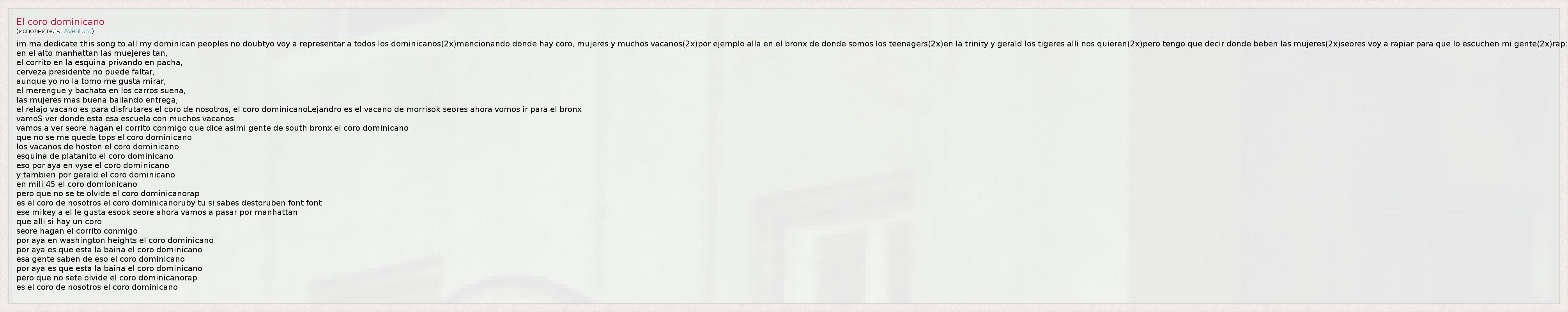 im ma dedicate this song to all my dominican peoples no doubtyo voy a representar a todos los dominicanos(2x)mencionando donde hay coro, mujeres y muchos vacanos(2x)por ejemplo alla en el bronx de donde somos los teenagers(2x)en la trinity y gerald los tigeres alli nos quieren(2x)pero tengo que decir donde beben las mujeres(2x)seores voy a rapiar para que lo escuchen mi gente(2x)rap: en el alto manhattan las muejeres tan, el corrito en la esquina privando en pacha, cerveza presidente no puede faltar, aunque yo no la tomo me gusta mirar, el merengue y bachata en los carros suena, las mujeres mas buena bailando entrega, el relajo vacano es para disfrutares el coro de nosotros, el coro dominicanoLejandro es el vacano de morrisok seores ahora vomos ir para el bronx vamoS ver donde esta esa escuela con muchos vacanos vamos a ver seore hagan el corrito conmigo que dice asimi gente de south bronx el coro dominicano que no se me quede tops el coro dominicano los vacanos de hoston el coro dominicano esquina de platanito el coro dominicano eso por aya en vyse el coro dominicano y tambien por gerald el coro dominicano en mili 45 el coro domionicano pero que no se te olvide el coro dominicanorap es el coro de nosotros el coro dominicanoruby tu si sabes destoruben font font ese mikey a el le gusta esook seore ahora vamos a pasar por manhattan que alli si hay un coro seore hagan el corrito conmigo por aya en washington heights el coro dominicano por aya es que esta la baina el coro dominicano esa gente saben de eso el coro dominicano por aya es que esta la baina el coro dominicano pero que no sete olvide el coro dominicanorap es el coro de nosotros el coro dominicano