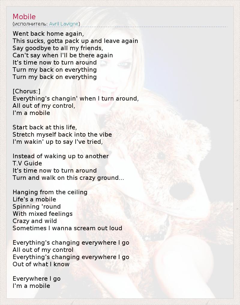 Went back home again, This sucks, gotta pack up and leave again Say goodbye to all my friends, Can't say when I'll be there again It's time now to turn around Turn my back on everything Turn my back on everything [Chorus:] Everything's changin' when I turn around, All out of my control, I'm a mobile Start back at this life, Stretch myself back into the vibe I'm wakin' up to say I've tried, Instead of waking up to another T.V Guide It's time now to turn around Turn and walk on this crazy ground... Hanging from the ceiling Life's a mobile Spinning 'round With mixed feelings Crazy and wild Sometimes I wanna scream out loud Everything's changing everywhere I go All out of my control Everything's changing everywhere I go Out of what I know Everywhere I go I'm a mobile