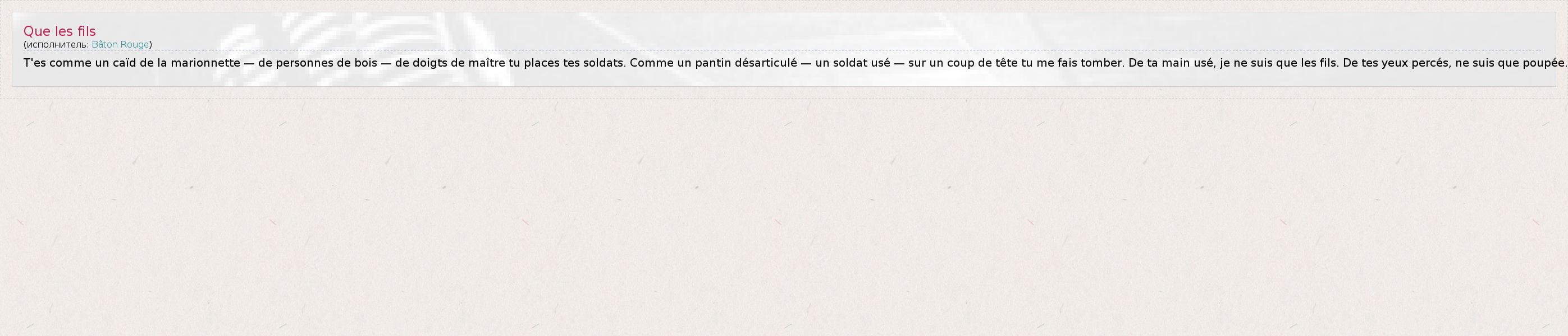 T'es comme un caïd de la marionnette — de personnes de bois — de doigts de maître tu places tes soldats. Comme un pantin désarticulé — un soldat usé — sur un coup de tête tu me fais tomber. De ta main usé, je ne suis que les fils. De tes yeux percés, ne suis que poupée.