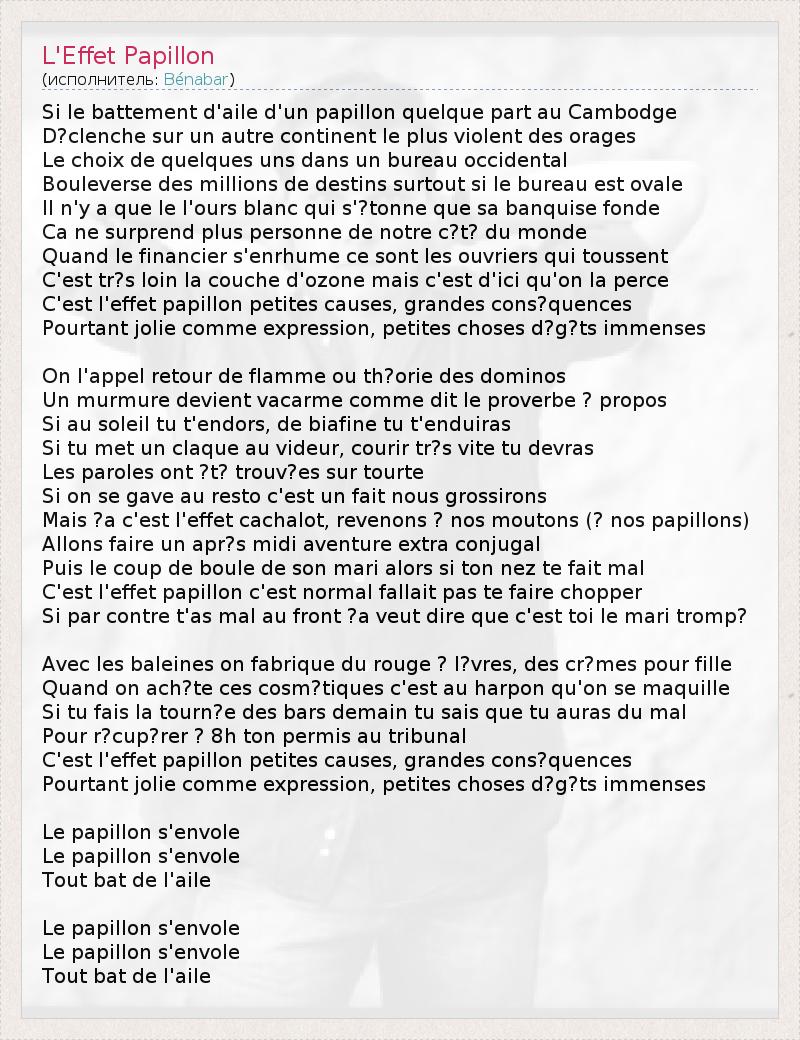 Si le battement d'aile d'un papillon quelque part au Cambodge D?clenche sur un autre continent le plus violent des orages Le choix de quelques uns dans un bureau occidental Bouleverse des millions de destins surtout si le bureau est ovale Il n'y a que le l'ours blanc qui s'?tonne que sa banquise fonde Ca ne surprend plus personne de notre c?t? du monde Quand le financier s'enrhume ce sont les ouvriers qui toussent C'est tr?s loin la couche d'ozone mais c'est d'ici qu'on la perce C'est l'effet papillon petites causes, grandes cons?quences Pourtant jolie comme expression, petites choses d?g?ts immenses On l'appel retour de flamme ou th?orie des dominos Un murmure devient vacarme comme dit le proverbe ? propos Si au soleil tu t'endors, de biafine tu t'enduiras Si tu met un claque au videur, courir tr?s vite tu devras Les paroles ont ?t? trouv?es sur tourte Si on se gave au resto c'est un fait nous grossirons Mais ?a c'est l'effet cachalot, revenons ? nos moutons (? nos papillons) Allons faire un apr?s midi aventure extra conjugal Puis le coup de boule de son mari alors si ton nez te fait mal C'est l'effet papillon c'est normal fallait pas te faire chopper Si par contre t'as mal au front ?a veut dire que c'est toi le mari tromp? Avec les baleines on fabrique du rouge ? l?vres, des cr?mes pour fille Quand on ach?te ces cosm?tiques c'est au harpon qu'on se maquille Si tu fais la tourn?e des bars demain tu sais que tu auras du mal Pour r?cup?rer ? 8h ton permis au tribunal C'est l'effet papillon petites causes, grandes cons?quences Pourtant jolie comme expression, petites choses d?g?ts immenses Le papillon s'envole Le papillon s'envole Tout bat de l'aile Le papillon s'envole Le papillon s'envole Tout bat de l'aile