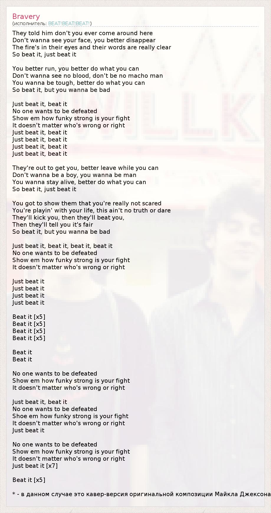 They told him don't you ever come around here Don't wanna see your face, you better disappear The fire's in their eyes and their words are really clear So beat it, just beat it You better run, you better do what you can Don't wanna see no blood, don't be no macho man You wanna be tough, better do what you can So beat it, but you wanna be bad Just beat it, beat it No one wants to be defeated Show em how funky strong is your fight It doesn't matter who's wrong or right Just beat it, beat it Just beat it, beat it Just beat it, beat it Just beat it, beat it They're out to get you, better leave while you can Don't wanna be a boy, you wanna be man You wanna stay alive, better do what you can So beat it, just beat it You got to show them that you're really not scared You're playin' with your life, this ain't no truth or dare They'll kick you, then they'll beat you, Then they'll tell you it's fair So beat it, but you wanna be bad Just beat it, beat it, beat it, beat it No one wants to be defeated Show em how funky strong is your fight It doesn't matter who's wrong or right Just beat it Just beat it Just beat it Just beat it Beat it [x5] Beat it [x5] Beat it [x5] Beat it [x5] Beat it Beat it No one wants to be defeated Show em how funky strong is your fight It doesn't matter who's wrong or right Just beat it, beat it No one wants to be defeated Shoe em how funky strong is your fight It doesn't matter who's wrong or right Just beat it No one wants to be defeated Show em how funky strong is your fight It doesn't matter who's wrong or right Just beat it [x7] Beat it [x5] * - в данном случае это кавер-версия оригинальной композиции Майкла Джексона