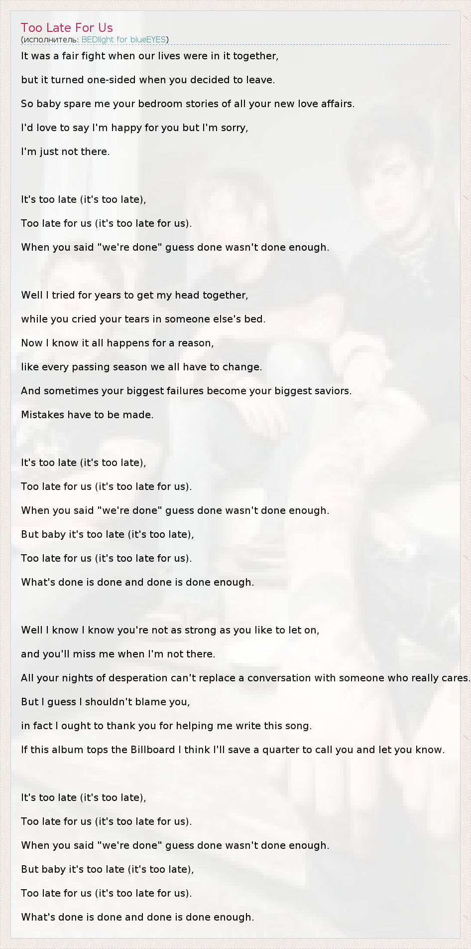 А как ты думаешь, о чем песня "Too Late For Us" ?