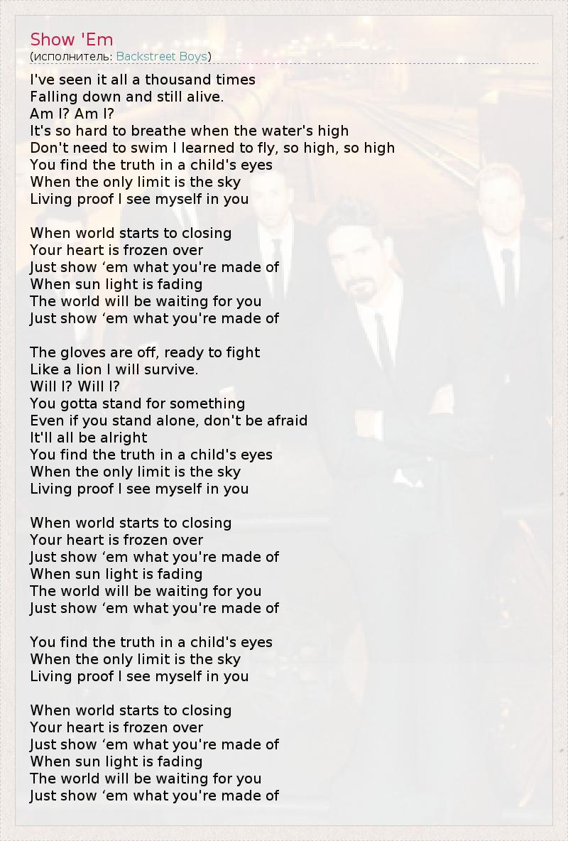 Я видел всё это тысячу раз, Падая и оставаясь в живых. Ведь так? Ведь так? Как трудно дышать, когда волны так высоки. Но зачем плавать, если я умею летать так высоко, так высоко? Ты найдешь правду в глазах ребенка, Когда единственный предел – это небо. Живое доказательство, я вижу себя в тебе. Когда мир начинает закрываться от тебя, Твое сердце замерзает. Просто покажи им, из чего ты сделан. Когда солнечный свет начнет угасать, Мир будет ждать тебя. Просто покажи им, из чего ты сделан. Начинаем борьбу, я готов к схватке, Как лев, я выживу. Ведь так? Ведь так? Ты должен постоять за что-нибудь, Даже если придется быть одному, не бойся. Всё будет в порядке. Ты найдешь правду в глазах ребенка, Когда единственный предел – это небо. Живое доказательство, я вижу себя в тебе. Когда мир начинает закрываться от тебя, Твое сердце замерзает. Просто покажи им, из чего ты сделан. Когда солнечный свет начнет угасать, Мир будет ждать тебя. Просто покажи им, из чего ты сделан. Ты найдешь правду в глазах ребенка, Когда единственный предел – это небо. Живое доказательство, я вижу себя в тебе. Когда мир начинает закрываться от тебя, Твое сердце замерзает. Просто покажи им, из чего ты сделан. Когда солнечный свет начнет угасать, Мир будет ждать тебя. Просто покажи им, из чего ты сделан.