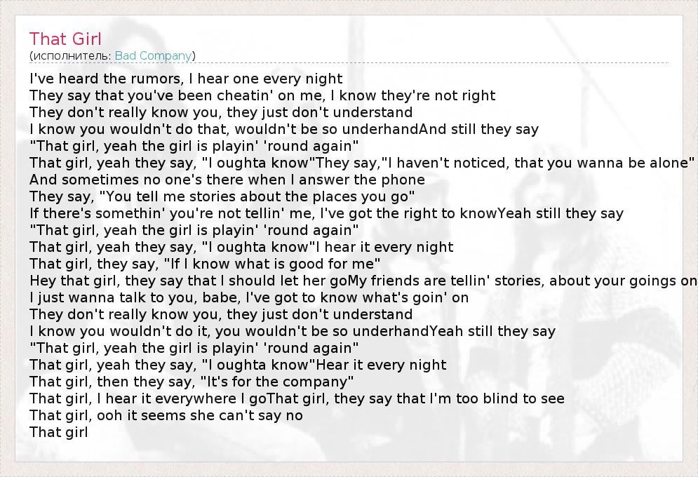 I've heard the rumors, I hear one every night They say that you've been cheatin' on me, I know they're not right They don't really know you, they just don't understand I know you wouldn't do that, wouldn't be so underhandAnd still they say "That girl, yeah the girl is playin' 'round again" That girl, yeah they say, "I oughta know"They say,"I haven't noticed, that you wanna be alone" And sometimes no one's there when I answer the phone They say, "You tell me stories about the places you go" If there's somethin' you're not tellin' me, I've got the right to knowYeah still they say "That girl, yeah the girl is playin' 'round again" That girl, yeah they say, "I oughta know"I hear it every night That girl, they say, "If I know what is good for me" Hey that girl, they say that I should let her goMy friends are tellin' stories, about your goings on I just wanna talk to you, babe, I've got to know what's goin' on They don't really know you, they just don't understand I know you wouldn't do it, you wouldn't be so underhandYeah still they say "That girl, yeah the girl is playin' 'round again" That girl, yeah they say, "I oughta know"Hear it every night That girl, then they say, "It's for the company" That girl, I hear it everywhere I goThat girl, they say that I'm too blind to see That girl, ooh it seems she can't say no That girl