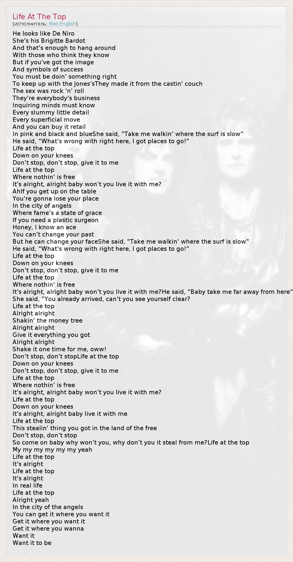 А как ты думаешь, о чем песня "Life At The Top" ?