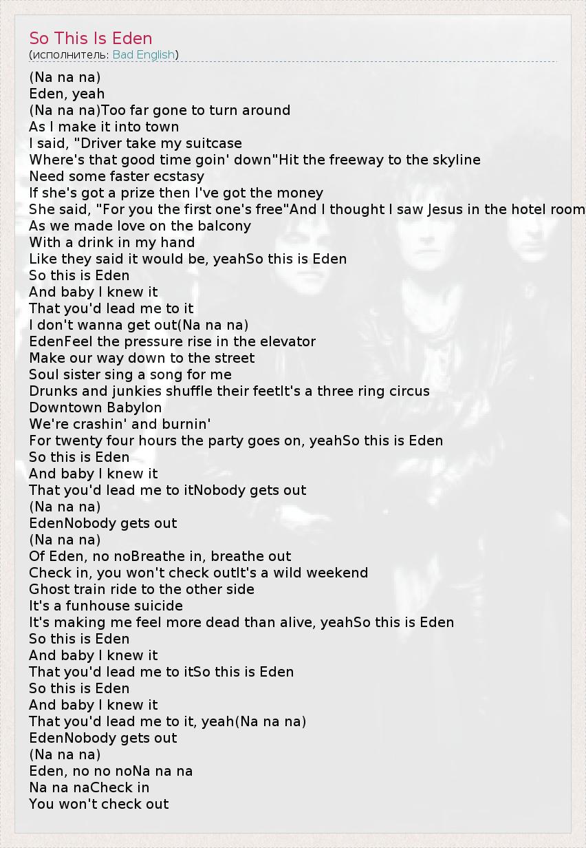 (Na na na) Eden, yeah (Na na na)Too far gone to turn around As I make it into town I said, "Driver take my suitcase Where's that good time goin' down"Hit the freeway to the skyline Need some faster ecstasy If she's got a prize then I've got the money She said, "For you the first one's free"And I thought I saw Jesus in the hotel room As we made love on the balcony With a drink in my hand Like they said it would be, yeahSo this is Eden So this is Eden And baby I knew it That you'd lead me to it I don't wanna get out(Na na na) EdenFeel the pressure rise in the elevator Make our way down to the street Soul sister sing a song for me Drunks and junkies shuffle their feetIt's a three ring circus Downtown Babylon We're crashin' and burnin' For twenty four hours the party goes on, yeahSo this is Eden So this is Eden And baby I knew it That you'd lead me to itNobody gets out (Na na na) EdenNobody gets out (Na na na) Of Eden, no noBreathe in, breathe out Check in, you won't check outIt's a wild weekend Ghost train ride to the other side It's a funhouse suicide It's making me feel more dead than alive, yeahSo this is Eden So this is Eden And baby I knew it That you'd lead me to itSo this is Eden So this is Eden And baby I knew it That you'd lead me to it, yeah(Na na na) EdenNobody gets out (Na na na) Eden, no no noNa na na Na na naCheck in You won't check out