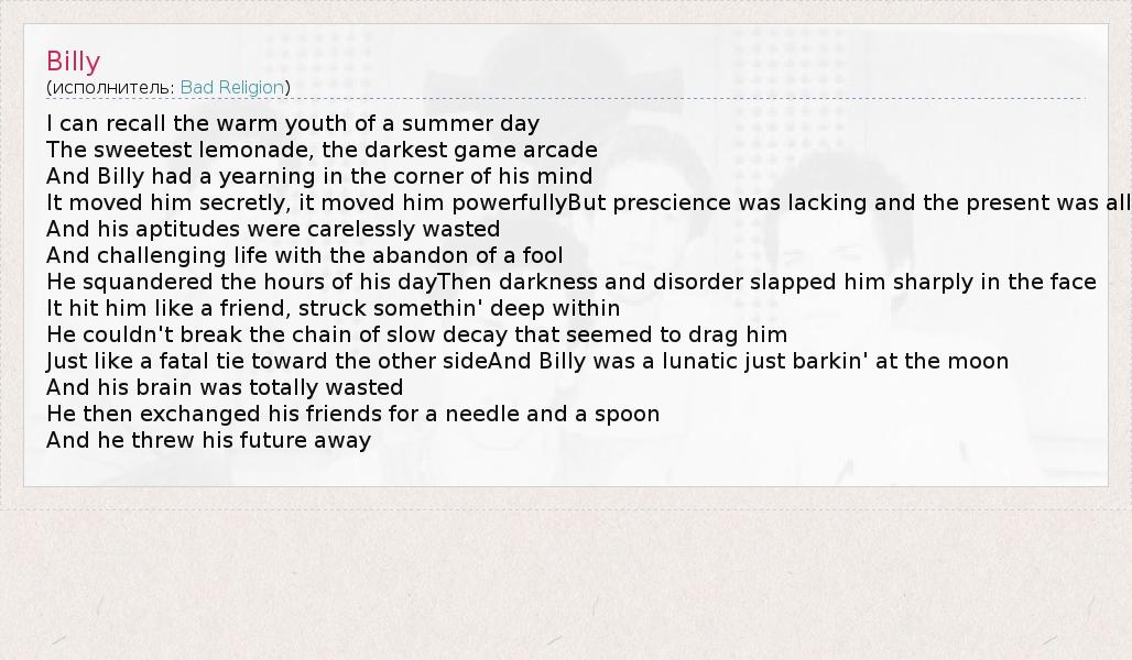 Это интересно:Bad Religion — американская панк-рок-группа из северного предместья Лос-Анджелеса, образованная в 1979 году.Отцы калифорнийского панка Bad Religion - одна из наиболее крупных фигур в истории панка и в тоже время один из самых коммерчески успешных американских панк-проектов. Серьезные и осмысленные тексты их песен, в которых речь часто идет о религии, политике, философии, экологии, выделяют BR из... продолжение