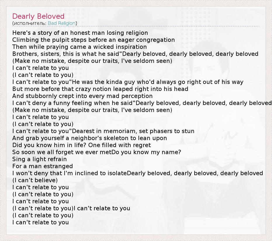 Here's a story of an honest man losing religion Climbing the pulpit steps before an eager congregation Then while praying came a wicked inspiration Brothers, sisters, this is what he said"Dearly beloved, dearly beloved, dearly beloved (Make no mistake, despite our traits, I've seldom seen) I can't relate to you (I can't relate to you) I can't relate to you"He was the kinda guy who'd always go right out of his way But more before that crazy notion leaped right into his head And stubbornly crept into every mad perception I can't deny a funny feeling when he said"Dearly beloved, dearly beloved, dearly beloved (Make no mistake, despite our traits, I've seldom seen) I can't relate to you (I can't relate to you) I can't relate to you"Dearest in memoriam, set phasers to stun And grab yourself a neighbor's skeleton to lean upon Did you know him in life? One filled with regret So soon we all forget we ever metDo you know my name? Sing a light refrain For a man estranged I won't deny that I'm inclined to isolateDearly beloved, dearly beloved, dearly beloved (I can't believe) I can't relate to you (I can't relate to you) I can't relate to you (I can't relate to you)I can't relate to you (I can't relate to you) I can't relate to you