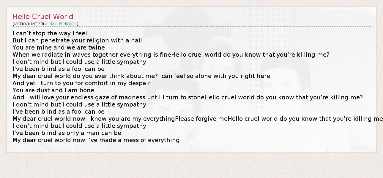 А как ты думаешь, о чем песня "Hello Cruel World" ?