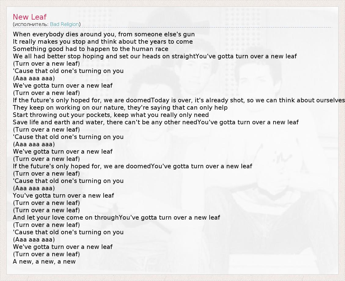 When everybody dies around you, from someone else's gun It really makes you stop and think about the years to come Something good had to happen to the human race We all had better stop hoping and set our heads on straightYou've gotta turn over a new leaf (Turn over a new leaf) 'Cause that old one's turning on you (Aaa aaa aaa) We've gotta turn over a new leaf (Turn over a new leaf) If the future's only hoped for, we are doomedToday is over, it's already shot, so we can think about ourselves They keep on working on our nature, they're saying that can only help Start throwing out your pockets, keep what you really only need Save life and earth and water, there can't be any other needYou've gotta turn over a new leaf (Turn over a new leaf) 'Cause that old one's turning on you (Aaa aaa aaa) We've gotta turn over a new leaf (Turn over a new leaf) If the future's only hoped for, we are doomedYou've gotta turn over a new leaf (Turn over a new leaf) 'Cause that old one's turning on you (Aaa aaa aaa) You've gotta turn over a new leaf (Turn over a new leaf) (Turn over a new leaf) And let your love come on throughYou've gotta turn over a new leaf (Turn over a new leaf) 'Cause that old one's turning on you (Aaa aaa aaa) We've gotta turn over a new leaf (Turn over a new leaf) A new, a new, a new