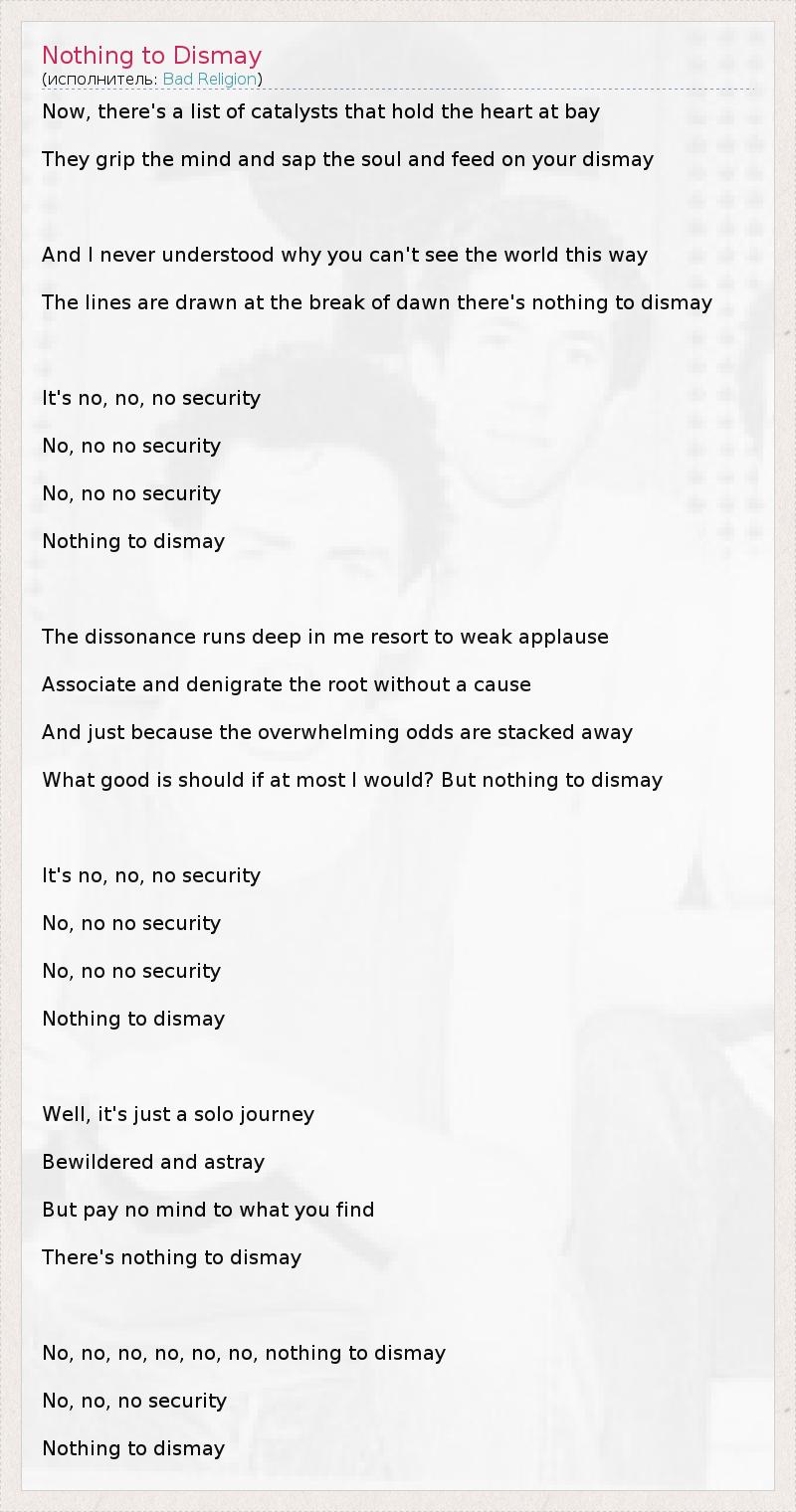 Now, there's a list of catalysts that hold the heart at bay They grip the mind and sap the soul and feed on your dismay And I never understood why you can't see the world this way The lines are drawn at the break of dawn there's nothing to dismay It's no, no, no security No, no no security No, no no security Nothing to dismay The dissonance runs deep in me resort to weak applause Associate and denigrate the root without a cause And just because the overwhelming odds are stacked away What good is should if at most I would? But nothing to dismay It's no, no, no security No, no no security No, no no security Nothing to dismay Well, it's just a solo journey Bewildered and astray But pay no mind to what you find There's nothing to dismay No, no, no, no, no, no, nothing to dismay No, no, no security Nothing to dismay