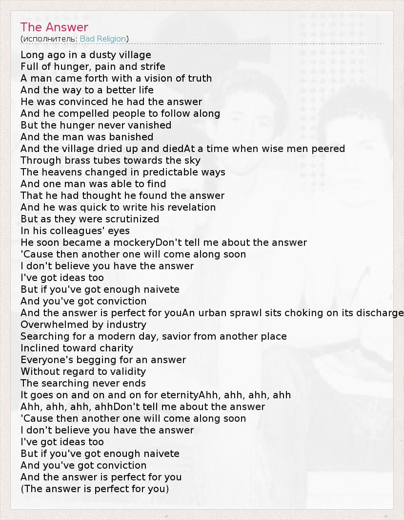 Это интересно:Bad Religion — американская панк-рок-группа из северного предместья Лос-Анджелеса, образованная в 1979 году.Отцы калифорнийского панка Bad Religion - одна из наиболее крупных фигур в истории панка и в тоже время один из самых коммерчески успешных американских панк-проектов. Серьезные и осмысленные тексты их песен, в которых речь часто идет о религии, политике, философии, экологии, выделяют BR из... продолжение
