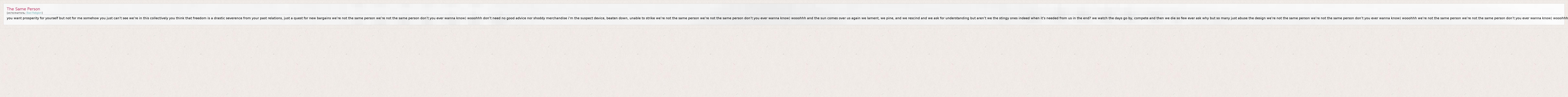 you want prosperity for yourself but not for me somehow you just can't see we're in this collectively you think that freedom is a drastic severence from your past relations, just a quest for new bargains we're not the same person we're not the same person don't you ever wanna know) wooohhh don't need no good advice nor shoddy merchandise i'm the suspect device, beaten down, unable to strike we're not the same person we're not the same person don't you ever wanna know) wooohhh and the sun comes over us again we lament, we pine, and we rescind and we ask for understanding but aren't we the stingy ones indeed when it's needed from us in the end? we watch the days go by, compete and then we die so few ever ask why but so many just abuse the design we're not the same person we're not the same person don't you ever wanna know) wooohhh we're not the same person we're not the same person don't you ever wanna know) wooohhh