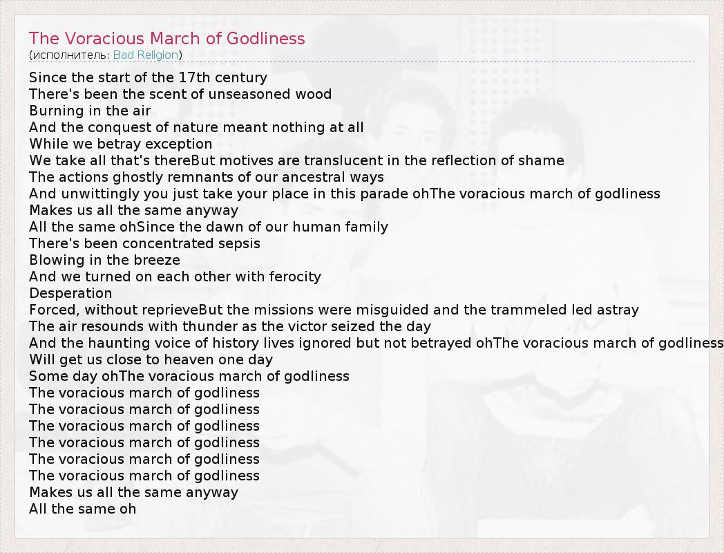 А как ты думаешь, о чем песня "The Voracious March of Godliness" ?