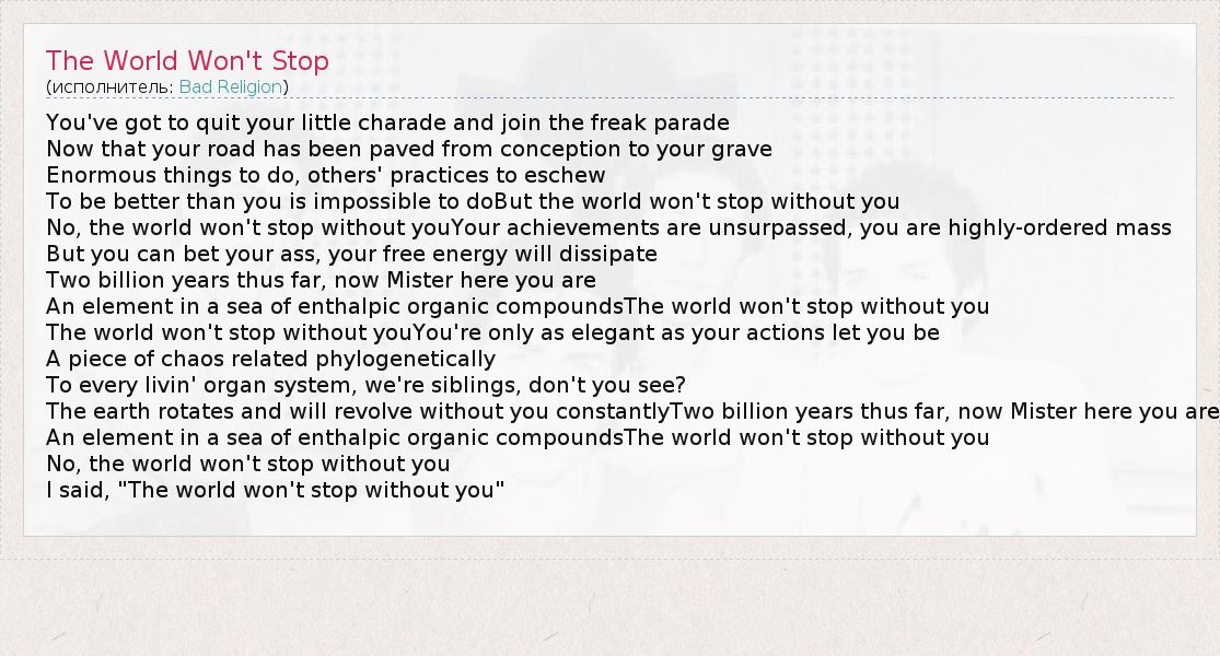 Это интересно:Bad Religion — американская панк-рок-группа из северного предместья Лос-Анджелеса, образованная в 1979 году.Отцы калифорнийского панка Bad Religion - одна из наиболее крупных фигур в истории панка и в тоже время один из самых коммерчески успешных американских панк-проектов. Серьезные и осмысленные тексты их песен, в которых речь часто идет о религии, политике, философии, экологии, выделяют BR из... продолжение