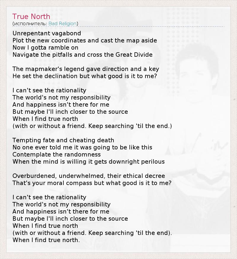 Это интересно:Bad Religion — американская панк-рок-группа из северного предместья Лос-Анджелеса, образованная в 1979 году.Отцы калифорнийского панка Bad Religion - одна из наиболее крупных фигур в истории панка и в тоже время один из самых коммерчески успешных американских панк-проектов. Серьезные и осмысленные тексты их песен, в которых речь часто идет о религии, политике, философии, экологии, выделяют BR из... продолжение