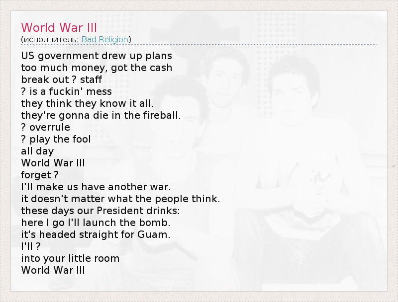 Это интересно:Bad Religion — американская панк-рок-группа из северного предместья Лос-Анджелеса, образованная в 1979 году.Отцы калифорнийского панка Bad Religion - одна из наиболее крупных фигур в истории панка и в тоже время один из самых коммерчески успешных американских панк-проектов. Серьезные и осмысленные тексты их песен, в которых речь часто идет о религии, политике, философии, экологии, выделяют BR из... продолжение