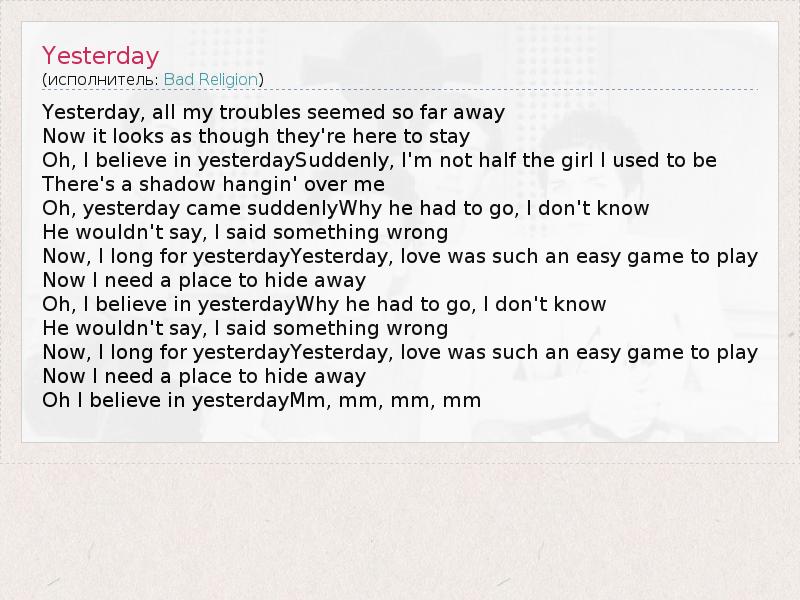 А как ты думаешь, о чем песня "Yesterday" ?