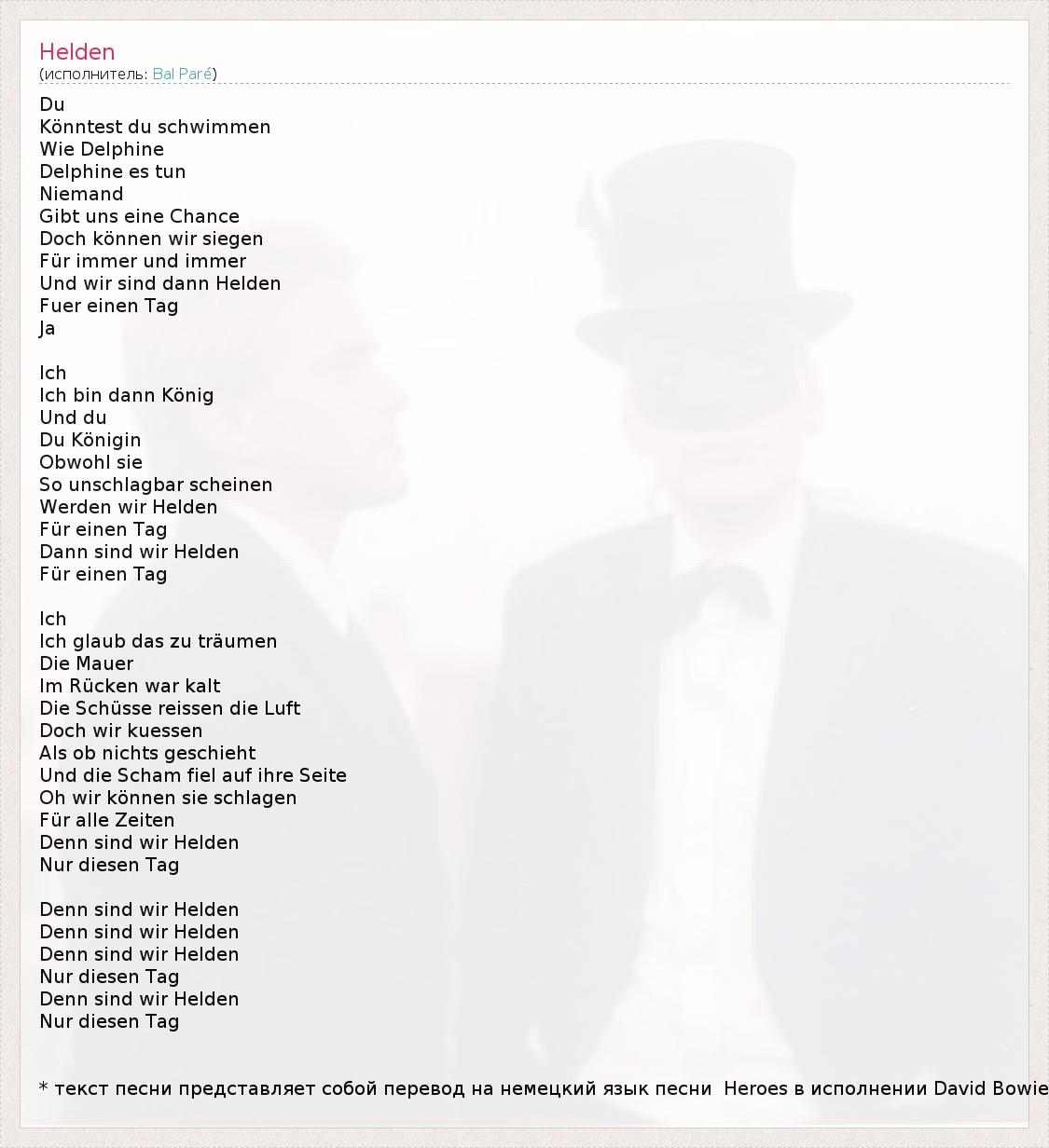 Du Könntest du schwimmen Wie Delphine Delphine es tun Niemand Gibt uns eine Chance Doch können wir siegen Für immer und immer Und wir sind dann Helden Fuer einen Tag Ja Ich Ich bin dann König Und du Du Königin Obwohl sie So unschlagbar scheinen Werden wir Helden Für einen Tag Dann sind wir Helden Für einen Tag Ich Ich glaub das zu träumen Die Mauer Im Rücken war kalt Die Schüsse reissen die Luft Doch wir kuessen Als ob nichts geschieht Und die Scham fiel auf ihre Seite Oh wir können sie schlagen Für alle Zeiten Denn sind wir Helden Nur diesen Tag Denn sind wir Helden Denn sind wir Helden Denn sind wir Helden Nur diesen Tag Denn sind wir Helden Nur diesen Tag * текст песни представляет собой перевод на немецкий язык песни Heroes в исполнении David Bowie
