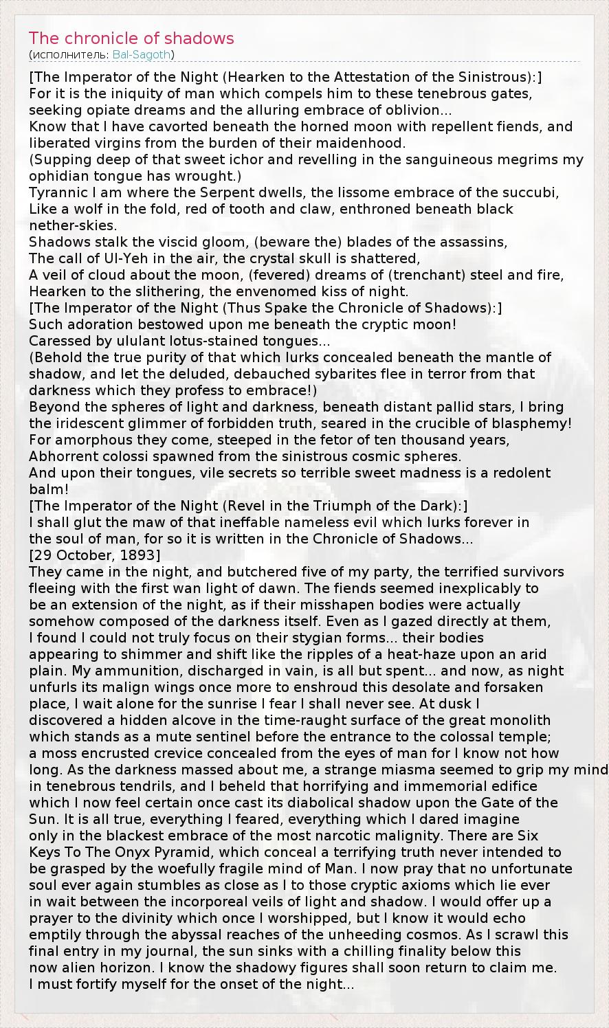 [The Imperator of the Night (Hearken to the Attestation of the Sinistrous):] For it is the iniquity of man which compels him to these tenebrous gates, seeking opiate dreams and the alluring embrace of oblivion... Know that I have cavorted beneath the horned moon with repellent fiends, and liberated virgins from the burden of their maidenhood. (Supping deep of that sweet ichor and revelling in the sanguineous megrims my ophidian tongue has wrought.) Tyrannic I am where the Serpent dwells, the lissome embrace of the succubi, Like a wolf in the fold, red of tooth and claw, enthroned beneath black nether-skies. Shadows stalk the viscid gloom, (beware the) blades of the assassins, The call of Ul-Yeh in the air, the crystal skull is shattered, A veil of cloud about the moon, (fevered) dreams of (trenchant) steel and fire, Hearken to the slithering, the envenomed kiss of night. [The Imperator of the Night (Thus Spake the Chronicle of Shadows):] Such adoration bestowed upon me beneath the cryptic moon! Caressed by ululant lotus-stained tongues... (Behold the true purity of that which lurks concealed beneath the mantle of shadow, and let the deluded, debauched sybarites flee in terror from that darkness which they profess to embrace!) Beyond the spheres of light and darkness, beneath distant pallid stars, I bring the iridescent glimmer of forbidden truth, seared in the crucible of blasphemy! For amorphous they come, steeped in the fetor of ten thousand years, Abhorrent colossi spawned from the sinistrous cosmic spheres. And upon their tongues, vile secrets so terrible sweet madness is a redolent balm! [The Imperator of the Night (Revel in the Triumph of the Dark):] I shall glut the maw of that ineffable nameless evil which lurks forever in the soul of man, for so it is written in the Chronicle of Shadows... [29 October, 1893] They came in the night, and butchered five of my party, the terrified survivors fleeing with the first wan light of dawn. The fiends seemed inexplicably to be an extension of the night, as if their misshapen bodies were actually somehow composed of the darkness itself. Even as I gazed directly at them, I found I could not truly focus on their stygian forms... their bodies appearing to shimmer and shift like the ripples of a heat-haze upon an arid plain. My ammunition, discharged in vain, is all but spent... and now, as night unfurls its malign wings once more to enshroud this desolate and forsaken place, I wait alone for the sunrise I fear I shall never see. At dusk I discovered a hidden alcove in the time-raught surface of the great monolith which stands as a mute sentinel before the entrance to the colossal temple; a moss encrusted crevice concealed from the eyes of man for I know not how long. As the darkness massed about me, a strange miasma seemed to grip my mind in tenebrous tendrils, and I beheld that horrifying and immemorial edifice which I now feel certain once cast its diabolical shadow upon the Gate of the Sun. It is all true, everything I feared, everything which I dared imagine only in the blackest embrace of the most narcotic malignity. There are Six Keys To The Onyx Pyramid, which conceal a terrifying truth never intended to be grasped by the woefully fragile mind of Man. I now pray that no unfortunate soul ever again stumbles as close as I to those cryptic axioms which lie ever in wait between the incorporeal veils of light and shadow. I would offer up a prayer to the divinity which once I worshipped, but I know it would echo emptily through the abyssal reaches of the unheeding cosmos. As I scrawl this final entry in my journal, the sun sinks with a chilling finality below this now alien horizon. I know the shadowy figures shall soon return to claim me. I must fortify myself for the onset of the night...