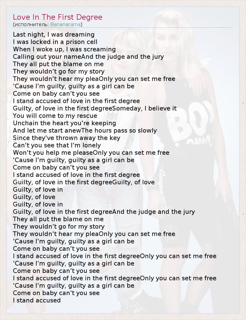 Last night, I was dreaming I was locked in a prison cell When I woke up, I was screaming Calling out your nameAnd the judge and the jury They all put the blame on me They wouldn't go for my story They wouldn't hear my pleaOnly you can set me free 'Cause I'm guilty, guilty as a girl can be Come on baby can't you see I stand accused of love in the first degree Guilty, of love in the first degreeSomeday, I believe it You will come to my rescue Unchain the heart you're keeping And let me start anewThe hours pass so slowly Since they've thrown away the key Can't you see that I'm lonely Won't you help me pleaseOnly you can set me free 'Cause I'm guilty, guilty as a girl can be Come on baby can't you see I stand accused of love in the first degree Guilty, of love in the first degreeGuilty, of love Guilty, of love in Guilty, of love Guilty, of love in Guilty, of love in the first degreeAnd the judge and the jury They all put the blame on me They wouldn't go for my story They wouldn't hear my pleaOnly you can set me free 'Cause I'm guilty, guilty as a girl can be Come on baby can't you see I stand accused of love in the first degreeOnly you can set me free 'Cause I'm guilty, guilty as a girl can be Come on baby can't you see I stand accused of love in the first degreeOnly you can set me free 'Cause I'm guilty, guilty as a girl can be Come on baby can't you see I stand accused