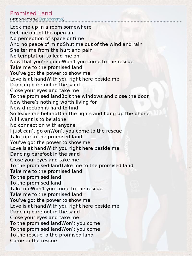 Lock me up in a room somewhere Get me out of the open air No perception of space or time And no peace of mindShut me out of the wind and rain Shelter me from the hurt and pain No temptation to lead me on Now that you're goneWon't you come to the rescue Take me to the promised land You've got the power to show me Love is at handWith you right here beside me Dancing barefoot in the sand Close your eyes and take me To the promised landBolt the windows and close the door Now there's nothing worth living for New direction is hard to find So leave me behindDim the lights and hang up the phone All I want is to be alone No connection with anyone I just can't go onWon't you come to the rescue Take me to the promised land You've got the power to show me Love is at handWith you right here beside me Dancing barefoot in the sand Close your eyes and take me To the promised landTake me to the promised land Take me to the promised land To the promised land To the promised land Take meWon't you come to the rescue Take me to the promised land You've got the power to show me Love is at handWith you right here beside me Dancing barefoot in the sand Close your eyes and take me To the promised landWon't you come To the promised landWon't you come To the rescueTo the promised land Come to the rescue