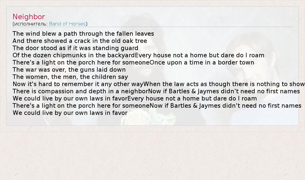 Это интересно:Band Of Horses, предварительно известные как Horses, являются американской инди-рок группой, сформированной в 2004 в Сиэтле Беном Бридвеллом, Матом Бруком, Критоном Барреттом и Робом Хэмптоном. Джо Арнон присоединился к оркестру в феврале 2006. Сейчас группа записывается на Columbia Records. Их часто сравнивают с My Morning Jacket,... продолжение