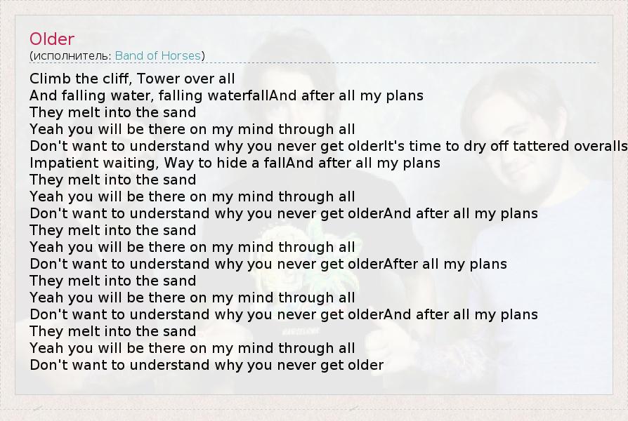 Climb the cliff, Tower over all And falling water, falling waterfallAnd after all my plans They melt into the sand Yeah you will be there on my mind through all Don't want to understand why you never get olderIt's time to dry off tattered overalls Impatient waiting, Way to hide a fallAnd after all my plans They melt into the sand Yeah you will be there on my mind through all Don't want to understand why you never get olderAnd after all my plans They melt into the sand Yeah you will be there on my mind through all Don't want to understand why you never get olderAfter all my plans They melt into the sand Yeah you will be there on my mind through all Don't want to understand why you never get olderAnd after all my plans They melt into the sand Yeah you will be there on my mind through all Don't want to understand why you never get older