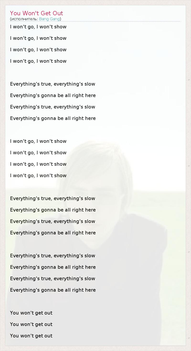 I won't go, I won't show I won't go, I won't show I won't go, I won't show I won't go, I won't show Everything's true, everything's slow Everything's gonna be all right here Everything's true, everything's slow Everything's gonna be all right here I won't go, I won't show I won't go, I won't show I won't go, I won't show I won't go, I won't show Everything's true, everything's slow Everything's gonna be all right here Everything's true, everything's slow Everything's gonna be all right here Everything's true, everything's slow Everything's gonna be all right here Everything's true, everything's slow Everything's gonna be all right here You won't get out You won't get out You won't get out